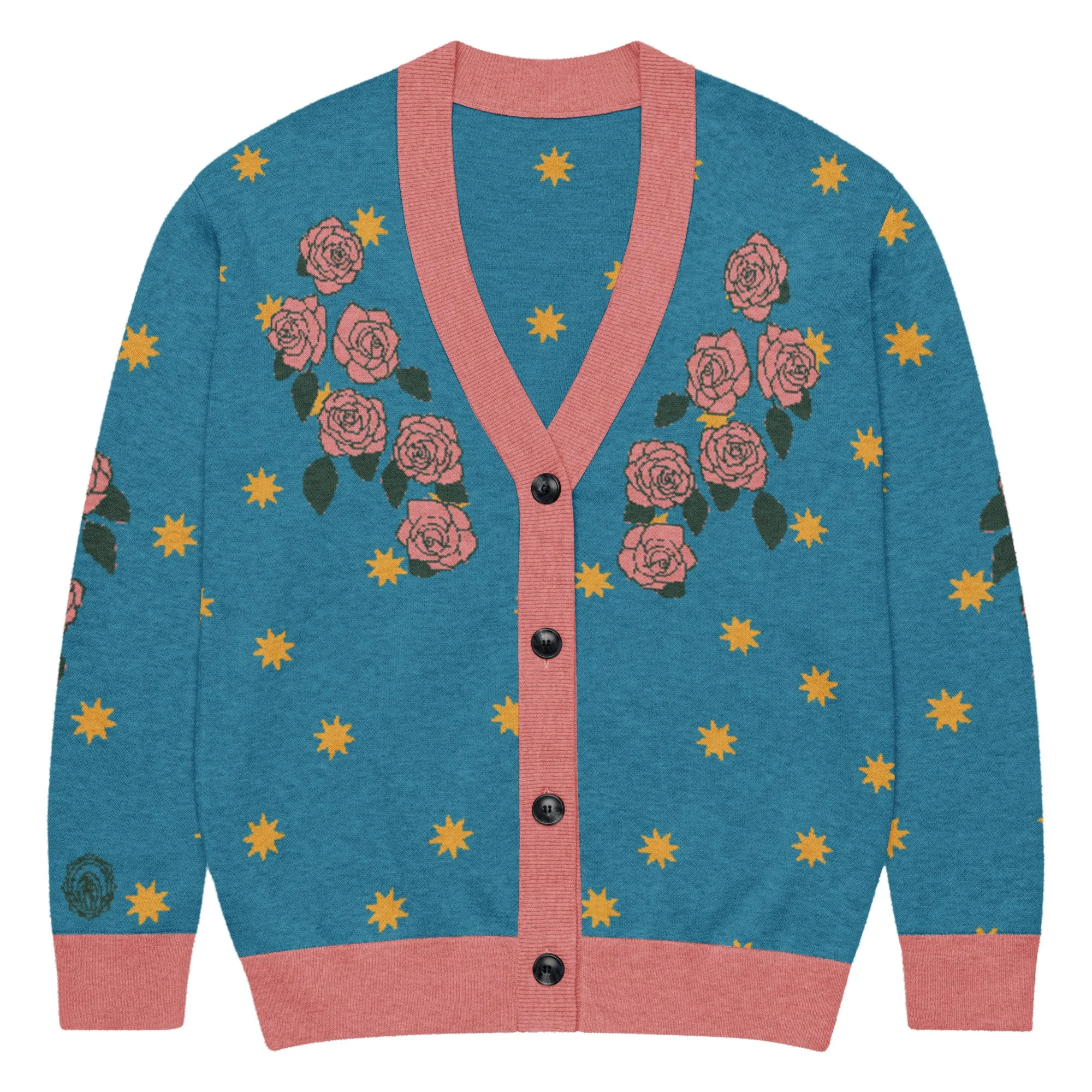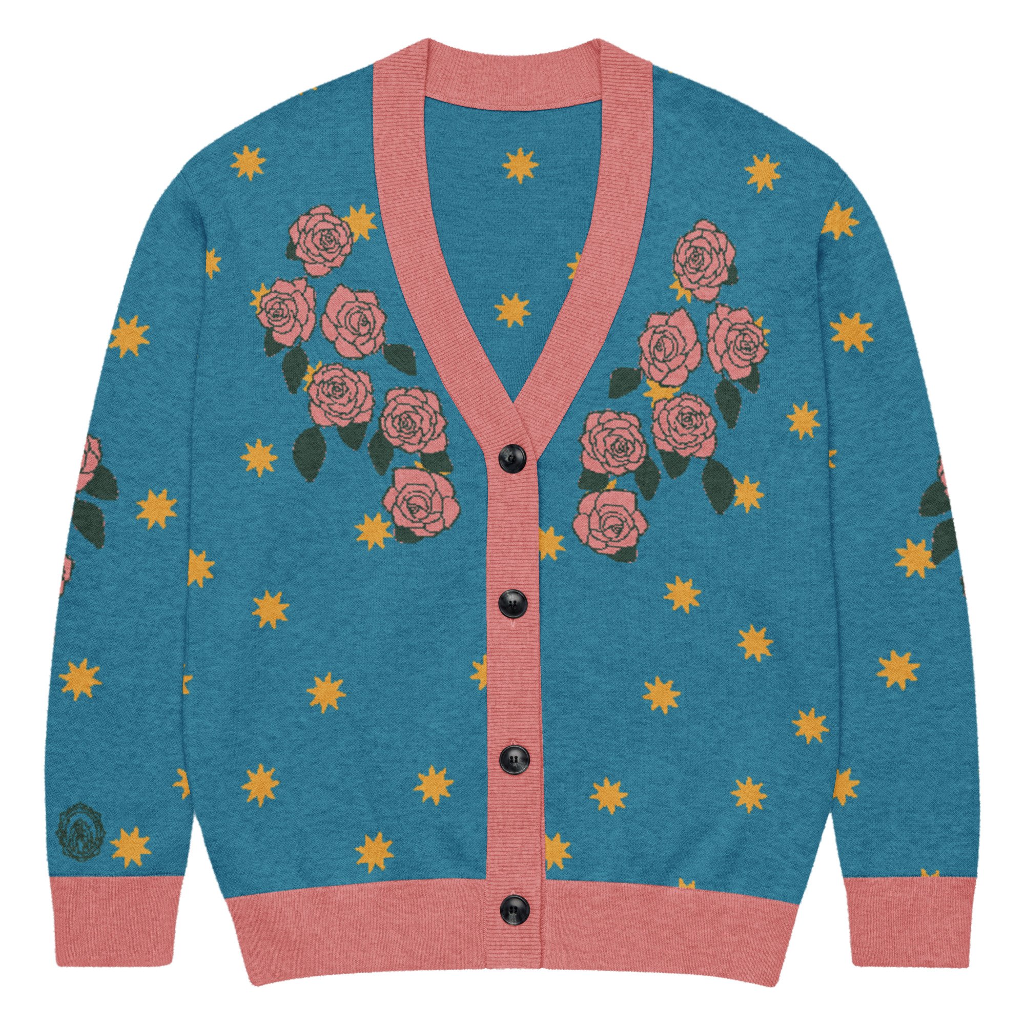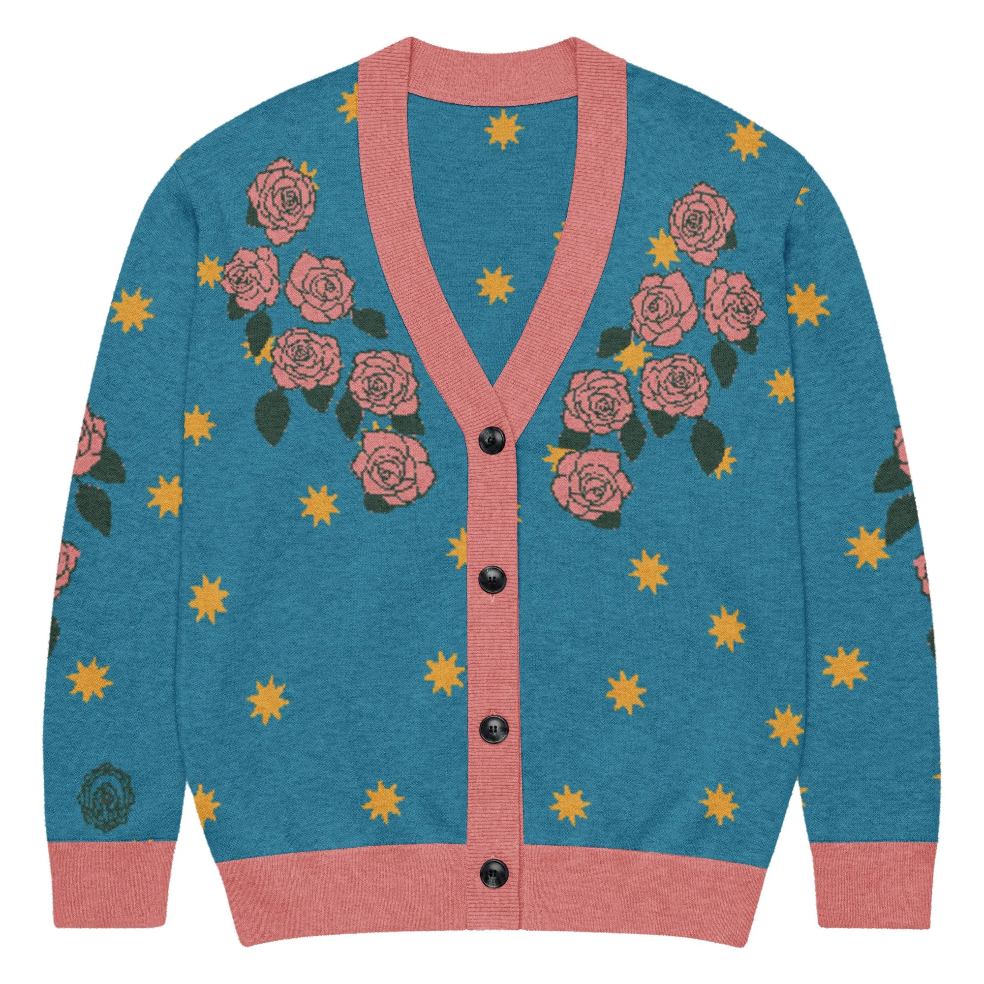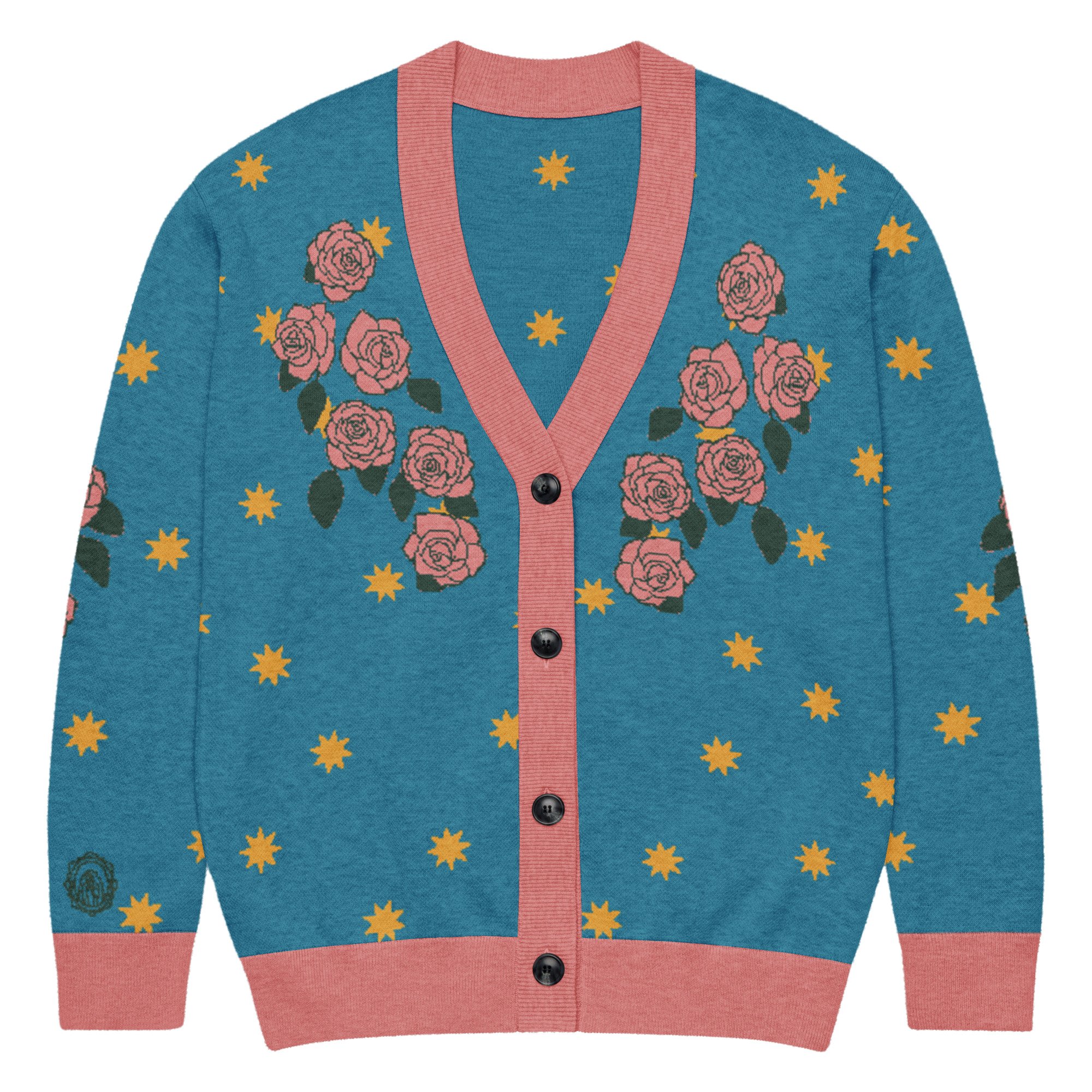 Express your devotion to Our Lady of Guadalupe with this elegant cardigan that even at-a-glance calls to mind the miraculous image of Mary as she appeared in the tilma of St. Juan Diego. Stars comprise the background while lush roses adorn the front and sleeves. An antique-style silhouette of Our Lady of Guadalupe graces the right-side wrist area: a contemporary and subtle detail to keep the Blessed Mother close to you. The cotton-blend fabric is both sturdy and soft, while the relaxed fit makes it ideal for layering. The jacquard knit adds a luxurious texture and modern look.