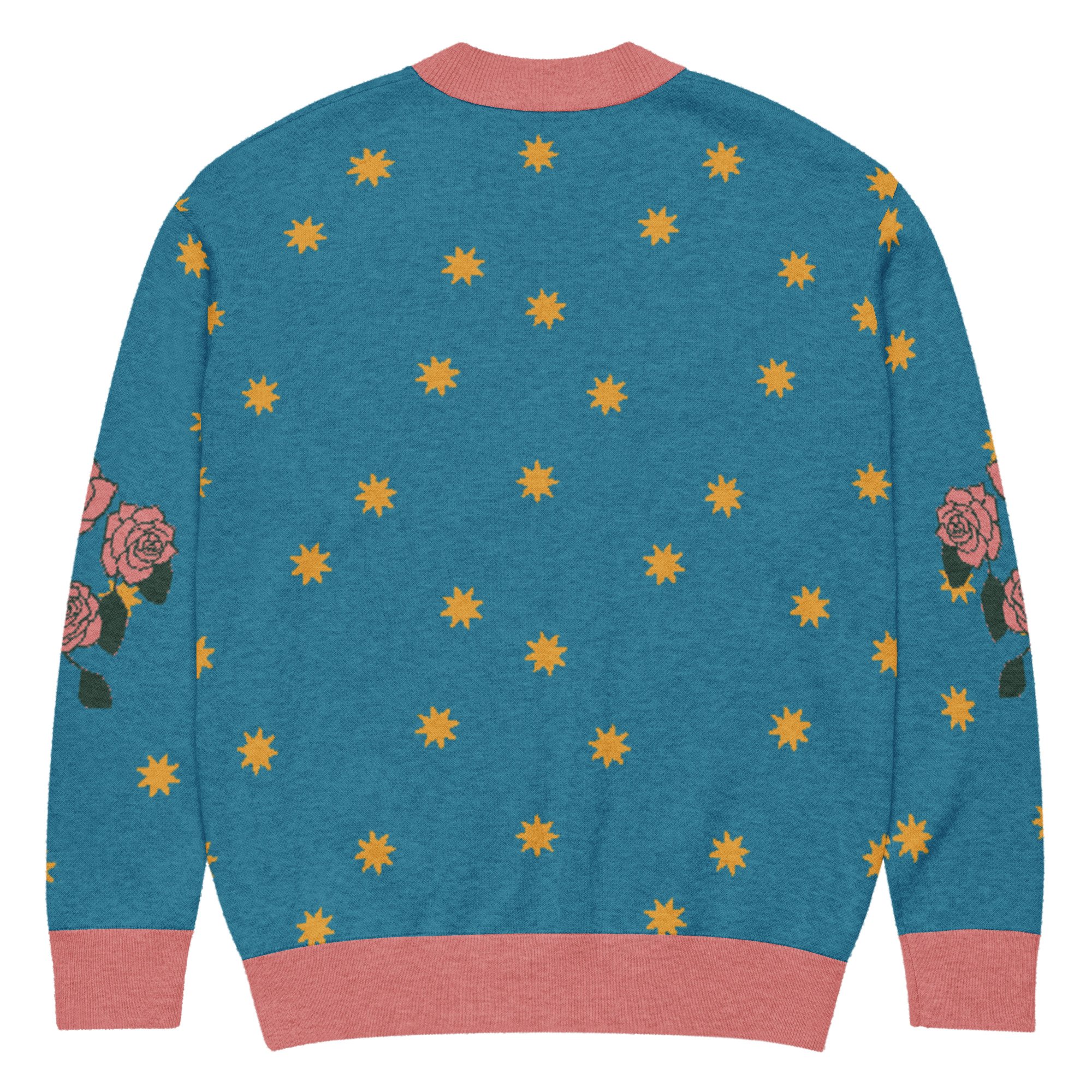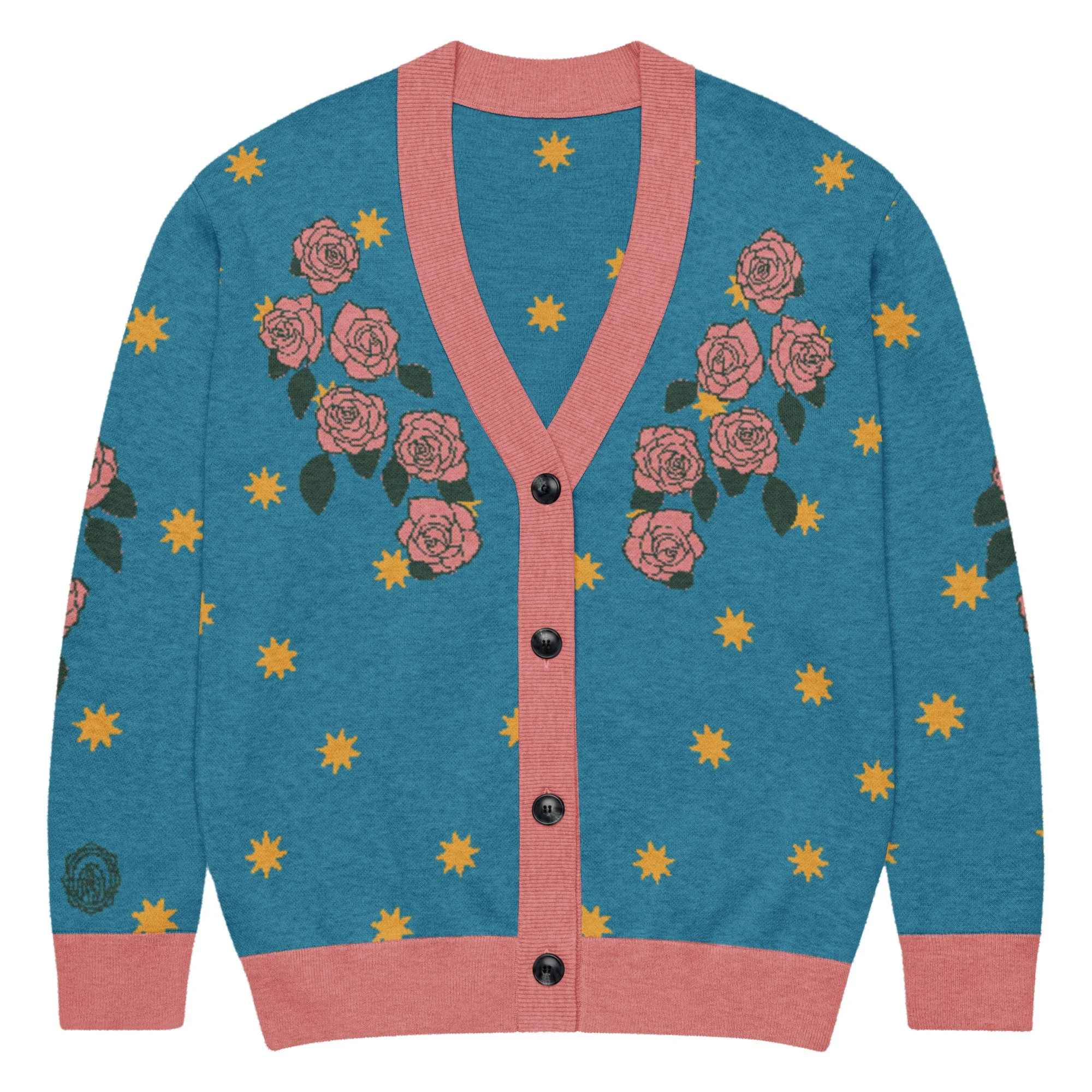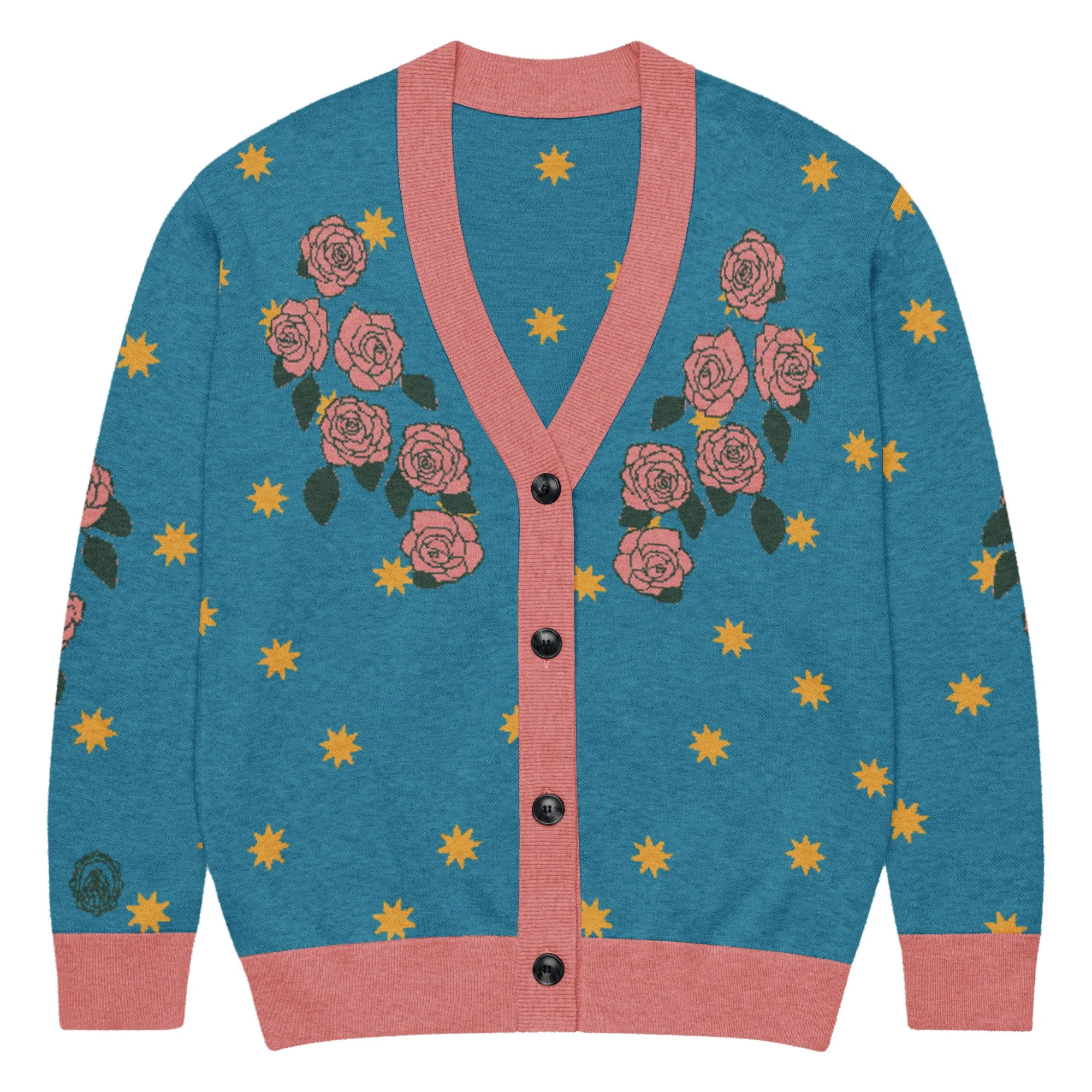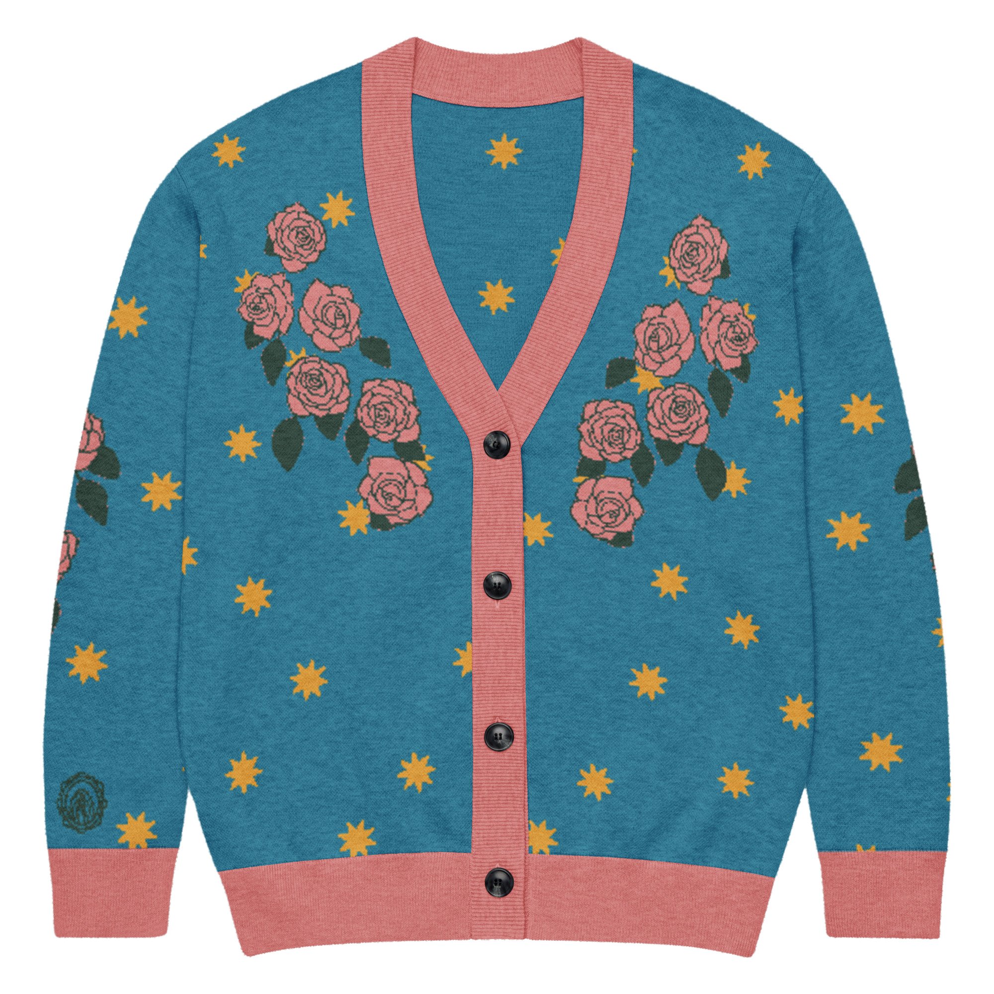 Express your devotion to Our Lady of Guadalupe with this elegant cardigan that even at-a-glance calls to mind the miraculous image of Mary as she appeared in the tilma of St. Juan Diego. Stars comprise the background while lush roses adorn the front and sleeves. An antique-style silhouette of Our Lady of Guadalupe graces the right-side wrist area: a contemporary and subtle detail to keep the Blessed Mother close to you. The cotton-blend fabric is both sturdy and soft, while the relaxed fit makes it ideal for layering. The jacquard knit adds a luxurious texture and modern look.