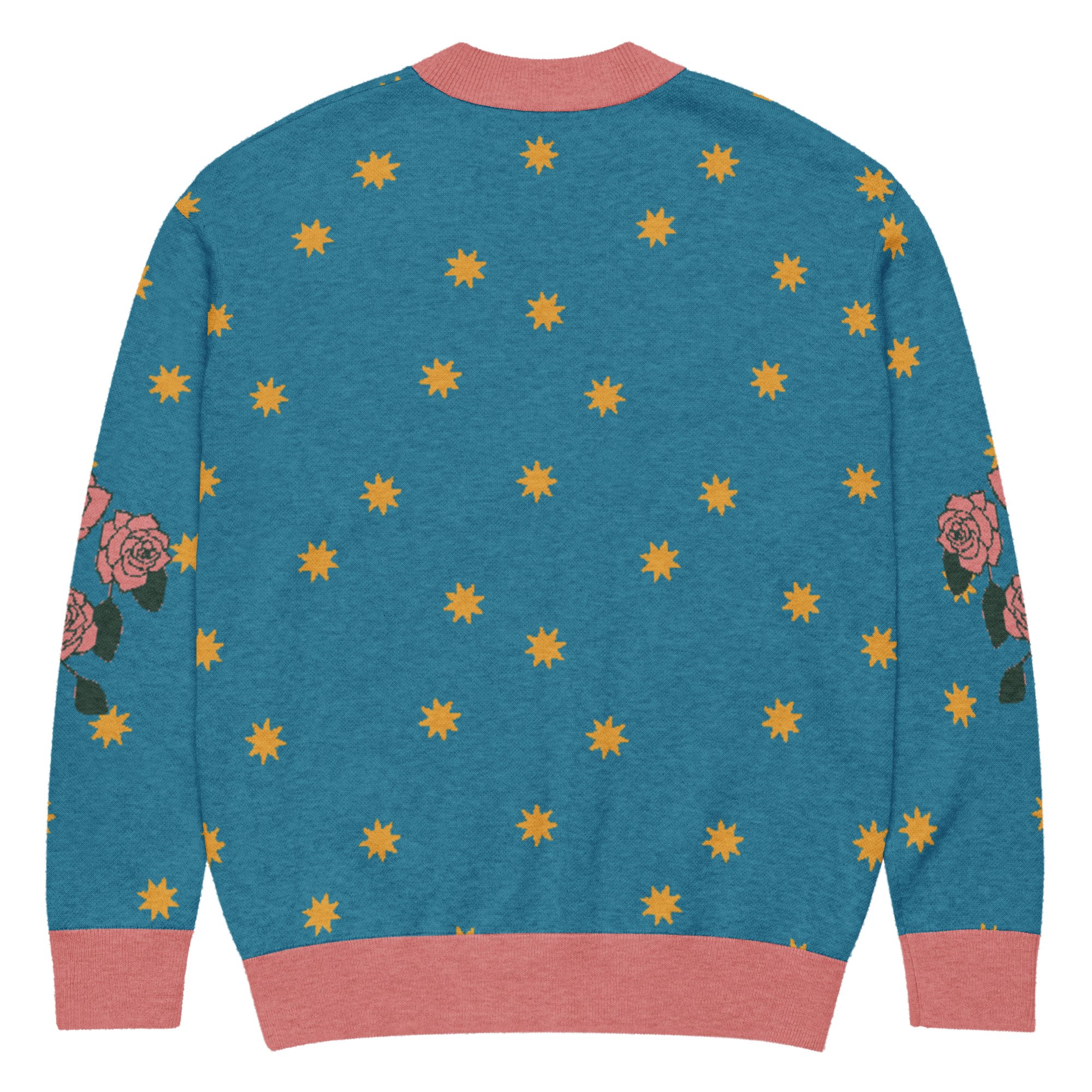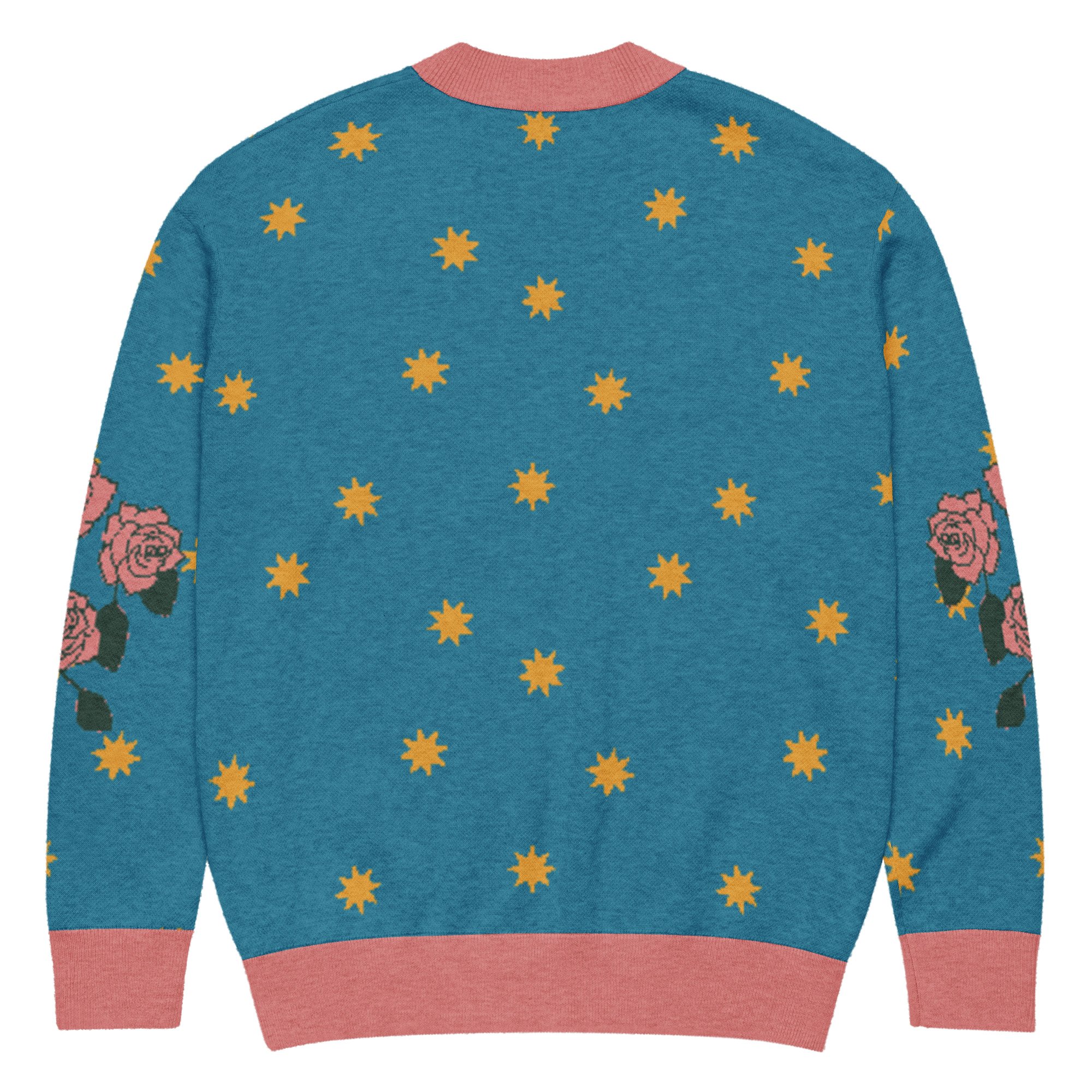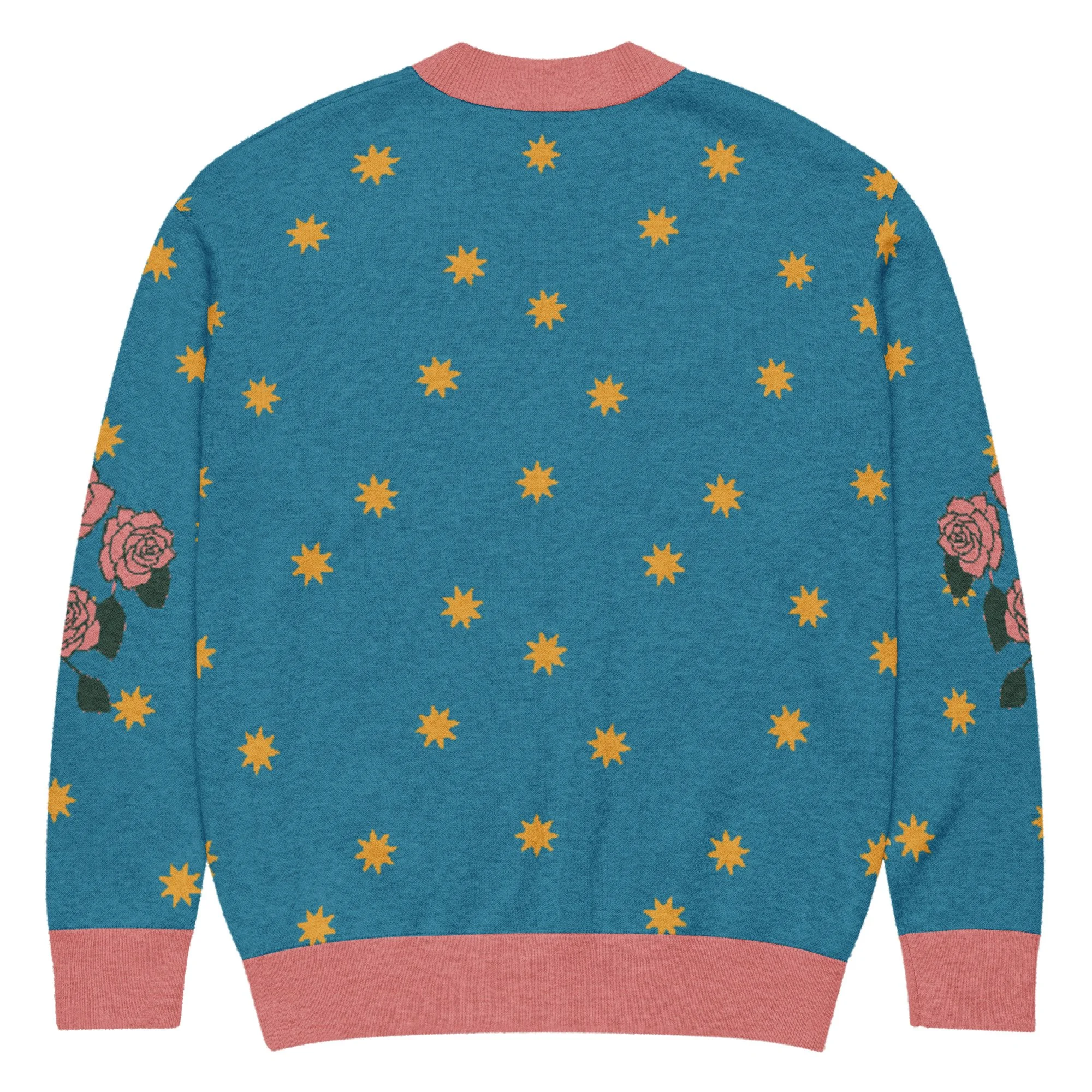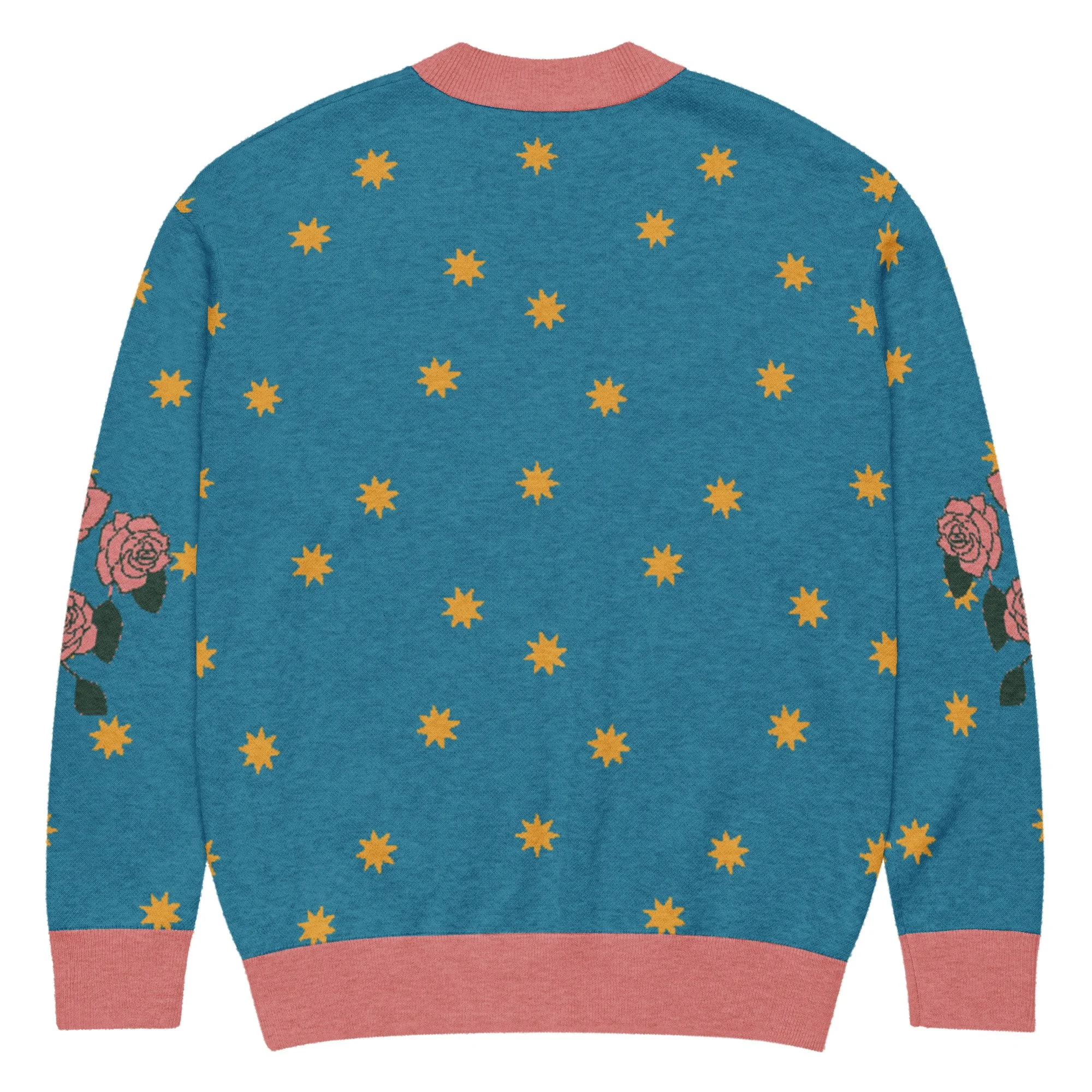 Express your devotion to Our Lady of Guadalupe with this elegant cardigan that even at-a-glance calls to mind the miraculous image of Mary as she appeared in the tilma of St. Juan Diego. Stars comprise the background while lush roses adorn the front and sleeves. An antique-style silhouette of Our Lady of Guadalupe graces the right-side wrist area: a contemporary and subtle detail to keep the Blessed Mother close to you. The cotton-blend fabric is both sturdy and soft, while the relaxed fit makes it ideal for layering. The jacquard knit adds a luxurious texture and modern look.