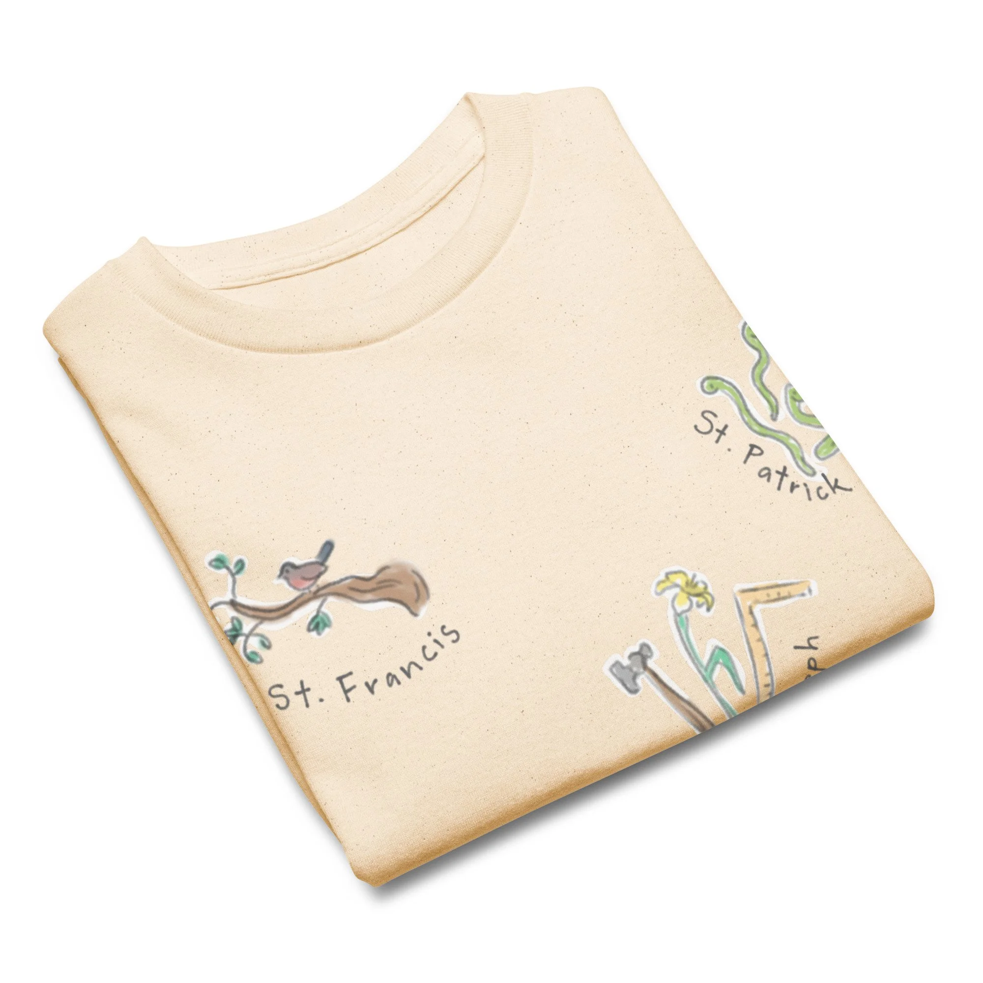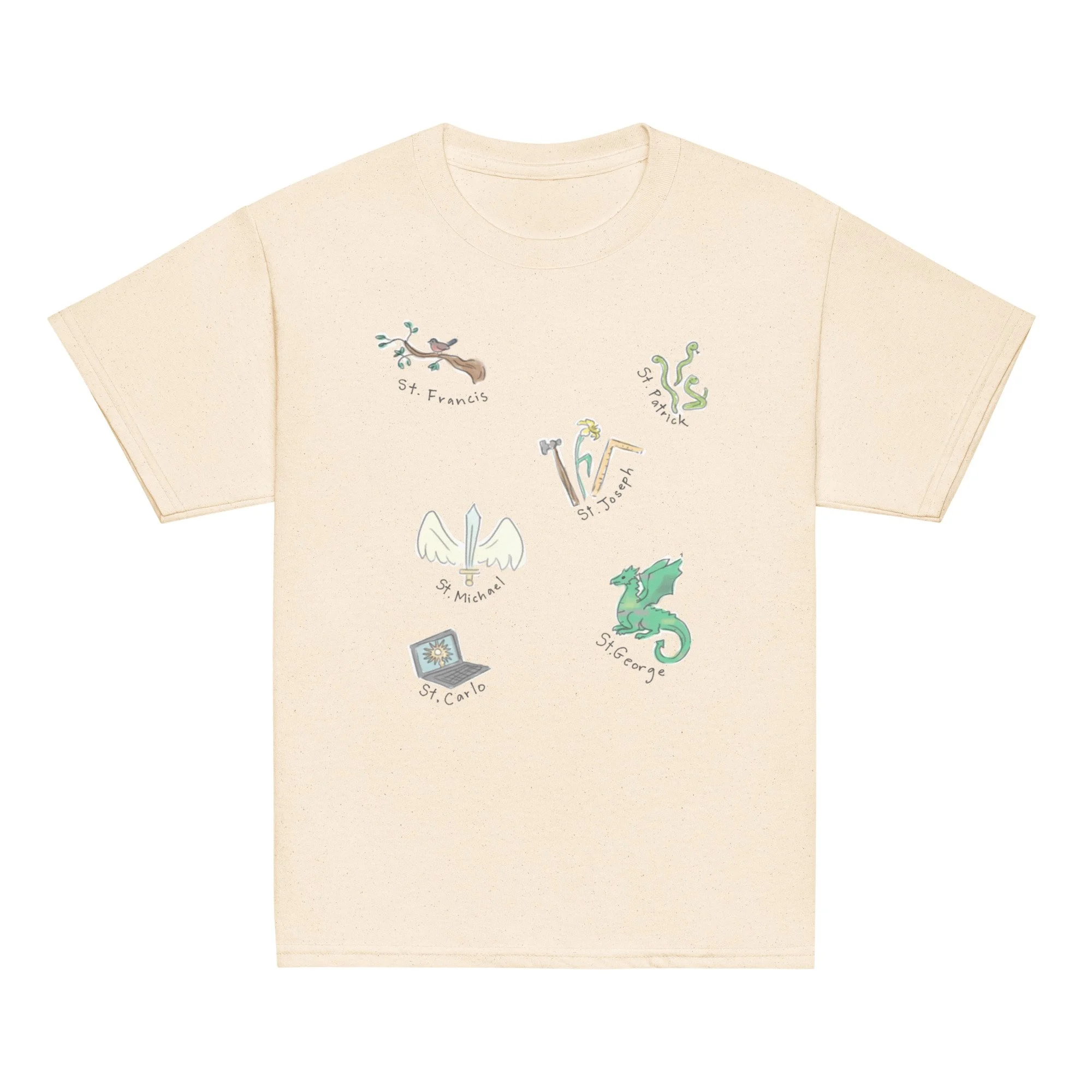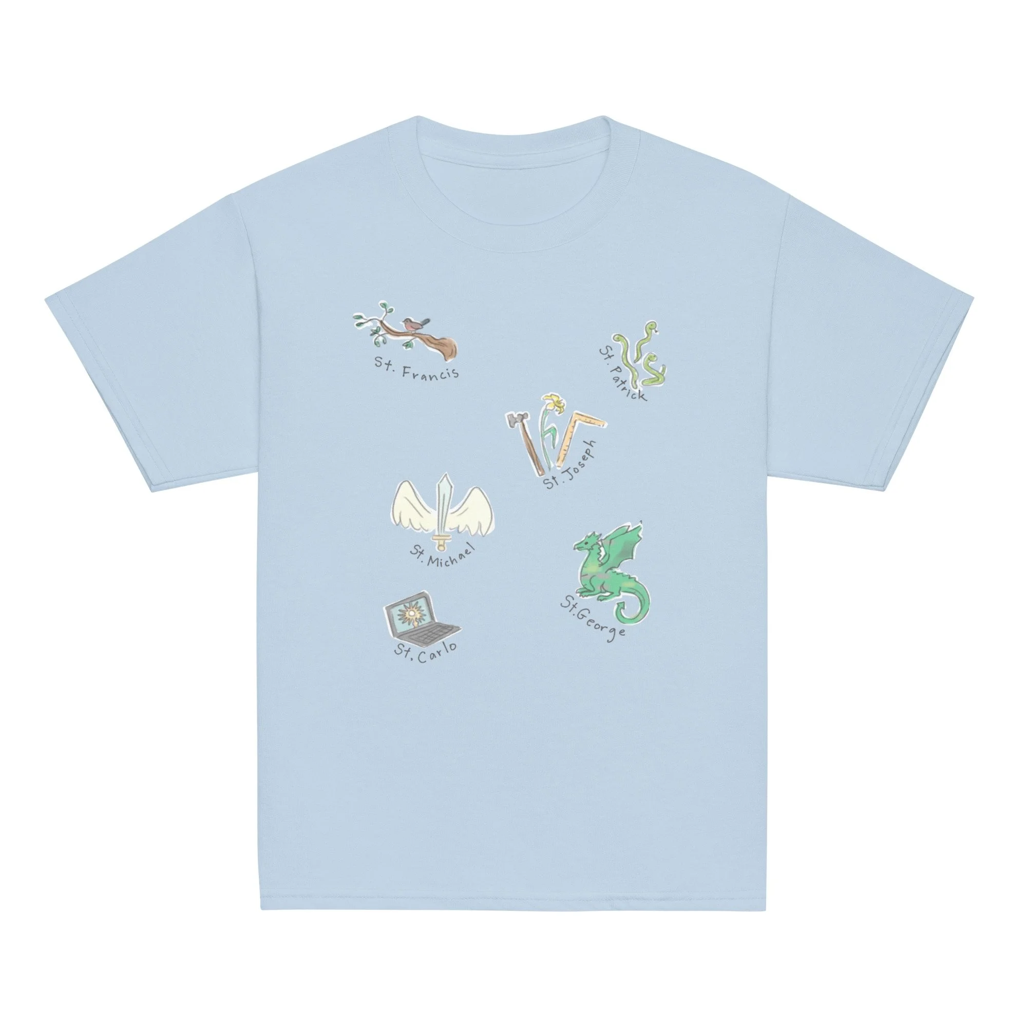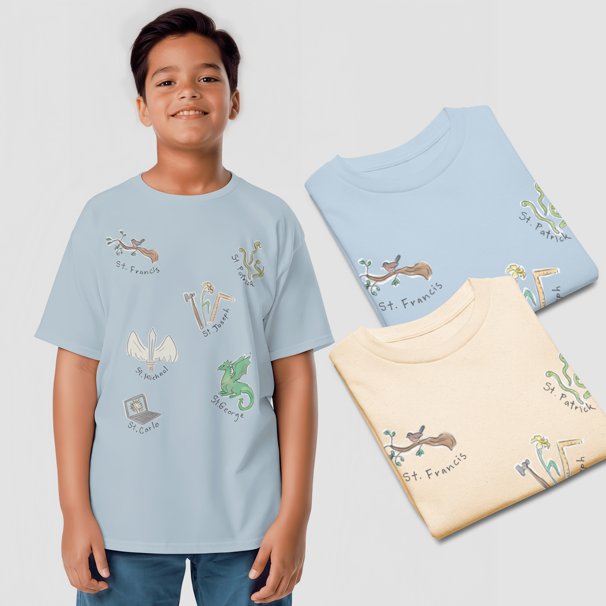 Our “Heaven’s Heroes” collection features some of the most celebrated Catholic saints by little boys, including St. Joseph, St. Michael the Archangel, St. George, St. Francis, St. Patrick, and St. Carlo Acutis. Playfully rendered in a hand-illustrated scattered arrangement, our saintly design looks whimsical and inspiring on this kids’ t-shirt!