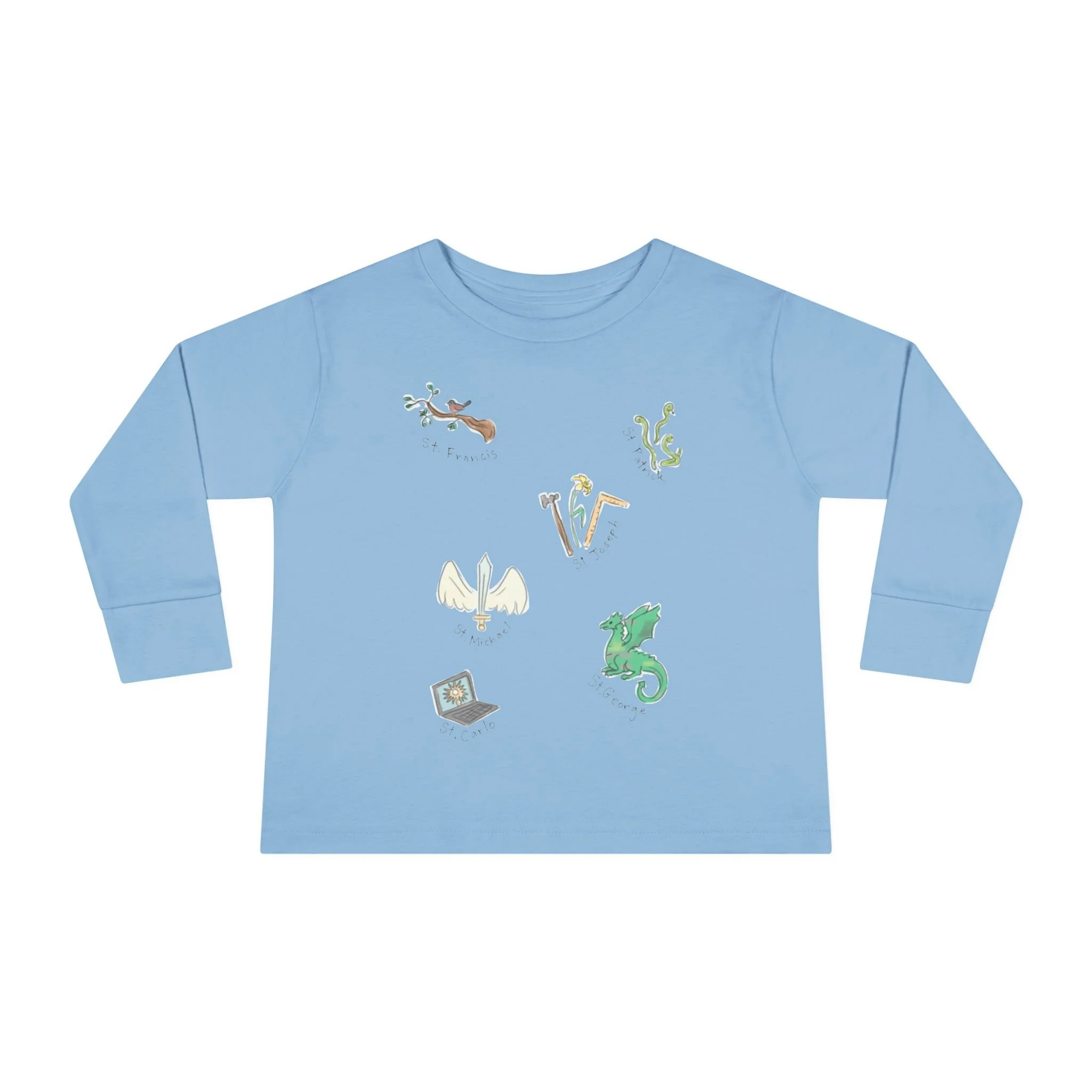 Our “Heaven’s Heroes” collection features some of the most celebrated Catholic saints by little boys, including St. Joseph, St. Michael the Archangel, St. George, St. Francis, St. Patrick, and St. Carlo Acutis. Playfully rendered in a hand-illustrated scattered arrangement, our saintly design looks whimsical and inspiring on this long sleeve t-shirt!