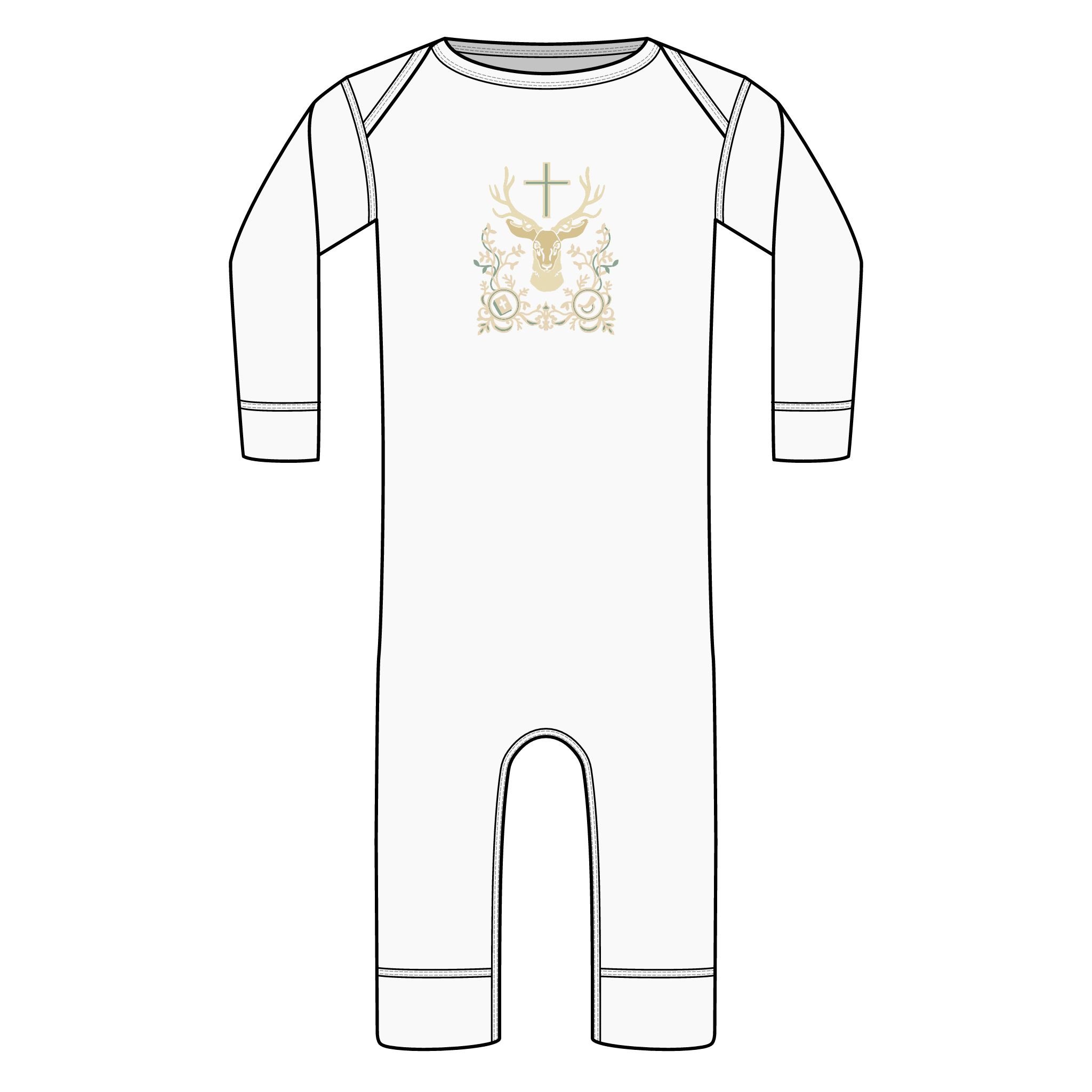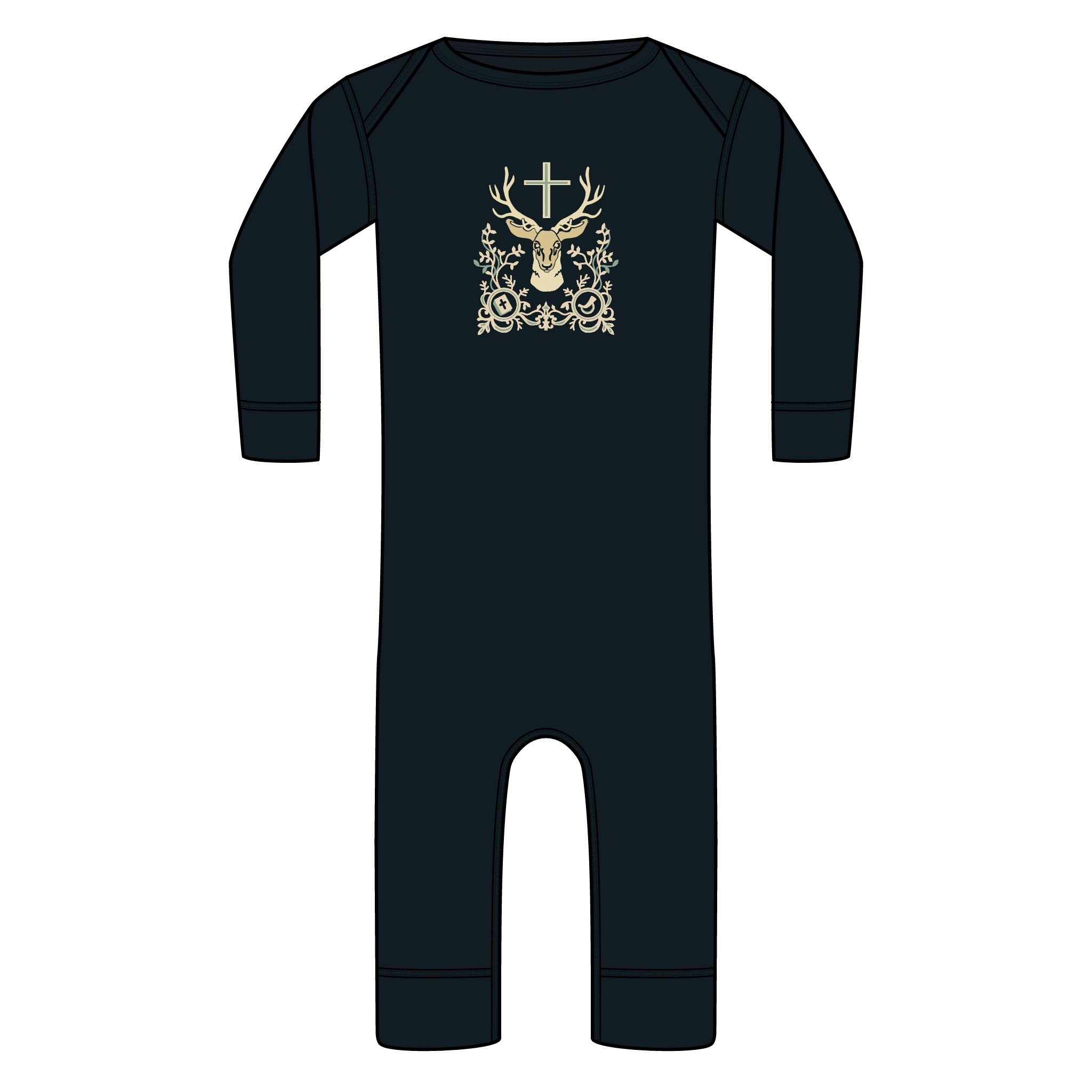 St. Hubert dedicated his life to the service of God after witnessing a sacred vision whilst out hunting: a stag with a crucifix glowing between its antlers. Commemorate the sainthood of Hubert with this infant one-piece, which features an interpretation of the vision in medieval filigree and stylishly neutral colors. The breathable 1x1 baby rib cotton hugs little ones with a flexible, lightweight feel while ribbed binding and side seams keep the shape through washes and play. A subtle, saint-inspired chest motif gives a quiet, heirloom touch — easy to layer under sweaters or worn alone for nap time and mass.