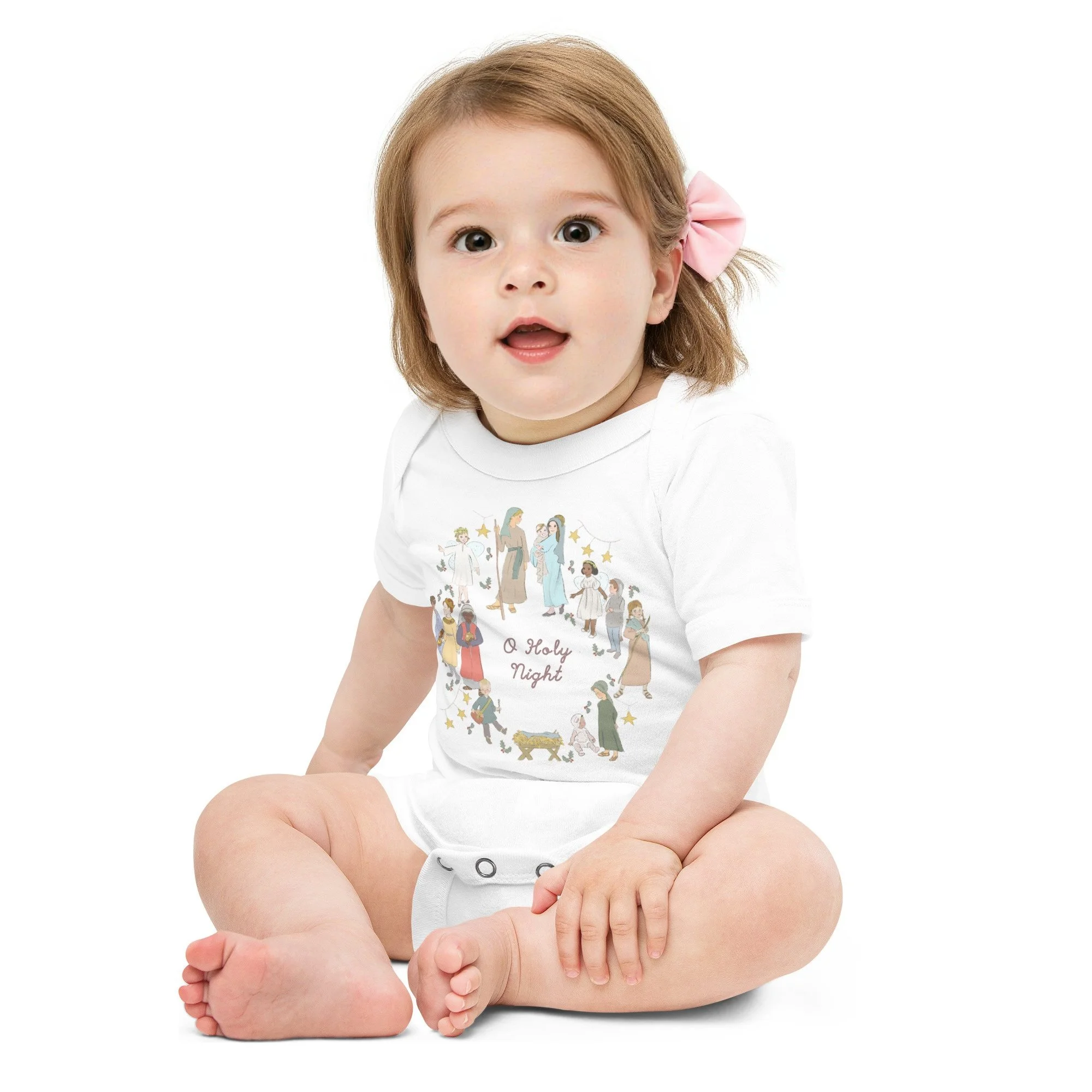 Dress your baby for a nostalgic Christmas with this 100% cotton, vintage-inspired one piece. It has three snap leg closure for easy changing, a comfortable envelope neckline, and a beautiful print that's bound to get the baby all happy and giggling. Images of joyful children dressed for a Nativity pageant scatter across the front of this bodysuit, which reads the melodic title, "O Holy Night."